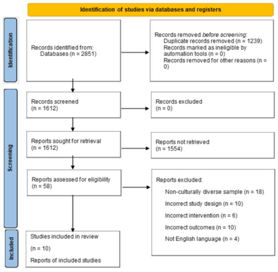 As a result of our initial search, 2851 studies were identified, reduced to 1612 after the removal of duplicates. After reviewing titles and abstracts to determine whether articles were relevant to the scope of the current study, 58 articles remained to be screened in full text. Of the 58 articles screened, an additional 48 were excluded (see Figure 1 for exclusion reasons). The reference lists of the remaining 10 articles were then screened, which revealed no additional article that met criteria for inclusion. A final total of 10 articles were included for review. The studies have been summarized to describe study quality, characteristics and outcomes.