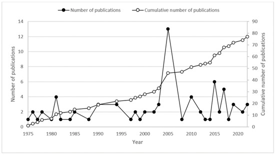 Number of publications and cumulative number of publications on oil spills in ice-infested waters according to the year.