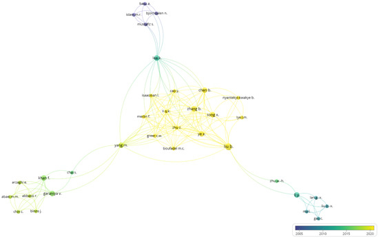 Scientific cooperation is a measure and indicator of the development of a discipline. The output of scientific collaboration is co-authored publications. The cooperation degree is calculated by dividing the total number of authors by the total number of papers. In this analysis, the cooperation degree of the authors is 2.5, which represents the average number of authors per article. The authors’ cooperation pattern was analyzed using VOSviewer. The largest set of connected authors consisted of 34 researchers, and other authors who were not connected with the other researchers were not included in the network. The authors’ cooperation network in oil spill research in ice-infested waters is depicted in Figure 2. The circles’ size illustrates the number of publications. The lines between the authors show the strength of collaboration between them. The colors represent the author’s average publication year on the topic.