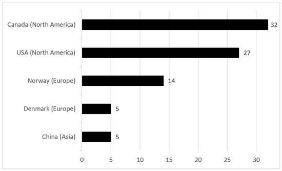 The broadness of the geographical coverage of the research collaborations is a measure of recognition and versatility of the research topic [36]. The researchers in oil spills research in ice-infested waters are from 17 different countries. Out of seventeen countries, thirteen of them are located in Europe (Norway, Denmark, and others), two of them are located in North America (Canada and USA), one of them is in Asia (China), and one of them is in Oceania (Australia). Figure 3 illustrates the top five most productive countries in oil spill research in ice-infested waters and the contribution of each country to the field. The analysis of the geographical distribution of the literature shows that twelve countries (70.6%) have published fewer than five articles, two countries have published five articles, and only three countries (17.6%) have published more than 10 articles.