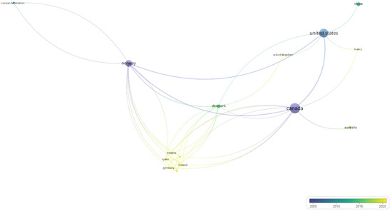 The cooperation network between the countries in oil spill research in ice-infested waters is depicted in Figure 4. The countries that are not connected with other countries are not included in the network. The size of the circles indicates the number of publications, the thickness of lines indicates the collaboration strength, and the colors represent the average year of the publications.