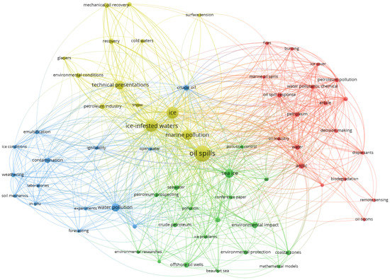 The identification of the popular terms and topics is the key to understanding the development of a research field. As a research area develops, the researchers conduct intensive work and they intersect in essential research directions, leading to the maturity and growth of a certain area. Therefore, pinpointing the hotspots of a research domain helps to track the trends and better understand the field. Figure 8 shows the most heated terms, which are general terms such as oil spills, ice, marine pollution, and ice-infested waters. It can be seen that other words are not widely used, showing that the research on the topic is scarce. The font size of the terms represents the relative advancement and significance of a term.
