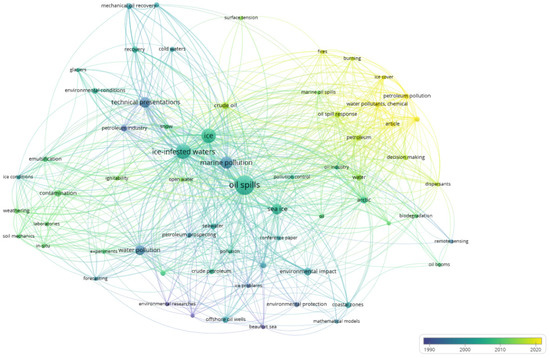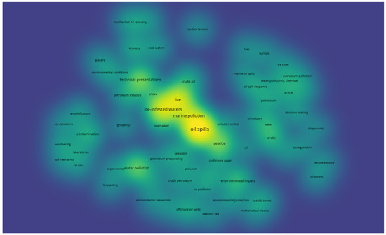 Figure 7 represents a terms analysis of the oil spill publications in ice-infested waters with the time information. The color of each term shows the average year of the publication in which the term was used. In the terms analysis, the terms from the 1990s are grouped with blue color, the terms that were used in the 2010s are marked with a green, whereas the terms that were commonly used in the 2020s are shown with yellow color. The term “ice-infested waters” is labeled as green, showing that the publications on the topic of oil spills in ice-infested waters are relatively new when they are compared to the oil spills in temperate regions. The intersection of the recent terms lies in the decision-making process in the area of oil spill response in ice-infested waters. However, this area is not well investigated as the sizes of the circles are not big enough. The terms heat map of the oil spill publications in ice-infested waters is depicted in Figure 8, which provides complementary information on the research field in addition to Figure 6 and Figure 7.