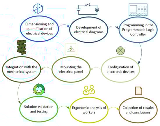 The mechanical devices and devices that make up the packaging solution were designed in parallel by a team specialized in mechanical engineering and will not be the focus of this work. However, it was necessary to integrate these mechanisms with the electrical system after the development process, and this implementation will be further detailed below. In addition, a methodology for ergonomic analysis of workers before and after the use of machinery was also developed. Therefore, throughout this section, the resources and methodologies necessary to carry out each stage of these processes will be detailed. Figure 2 illustrates a sequential diagram of the steps performed.