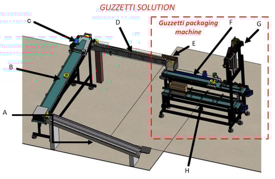 (A) Guzzetti machine exit conveyor; (B) Label conveyor; (C) Labeling machine; (D) Conveyor belt for the tape changer; (E) Tape turner; (F) Conveyor belt Guzzetti; (G) Pick-up system; and (H) Conveyor belt for boxes.
