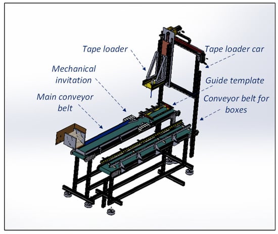 Upon entering the packaging machine, the tapes are in a horizontal position and undergo a mechanical invitation that orders them in a row. Therefore, they enter a guide template that accommodates a certain number of tapes, depending on the model to be packaged. When the last tape enters the template, a photoelectric sensor sends a command to the tape loader to collect the tapes. In this way, it collects all the tapes by displacing them on the “Z” axis, and a system of springs can penetrate the tapes without damaging them so that they can be displaced by the adhesion exerted. The movement system of the tape loader is performed by mechanical devices based on pulleys and belts and using two servo motors: one for movement on the “X” axis and another for the “Z” axis.