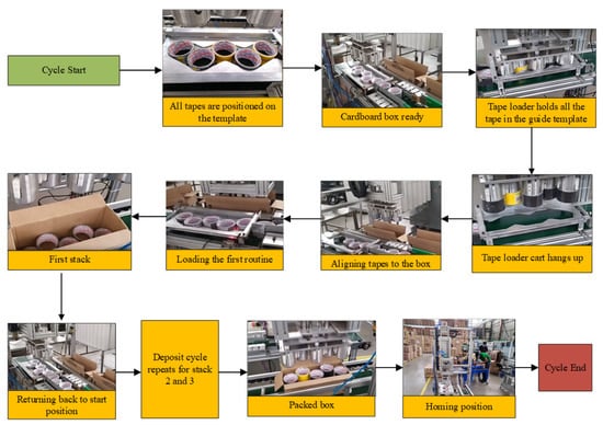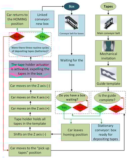 The tape loader’s locomotion system is called the “tape loader car.” Its function is to transport the tapes that were in the guide template to the parallel conveyor where the cardboard box is located. Therefore, the tape loader enters the cardboard box. Then, the pneumatic actuator, together with the mechanical solution of the tape extractor, expels the tapes from the loader in the box. After this stage, the loader returns to the starting point, and the process starts again until three stacks of tapes are completed. After the last stack of tapes, the box is complete and can proceed to close. The flowchart of this process is illustrated in Figure 5. It is noteworthy that the home position and the “pick up tapes” position, mentioned in the flowchart, are similar positions when the car is suspended and aligned with the guide. However, the car only departs from the home position in the deposit cycle of the first stack of tapes.