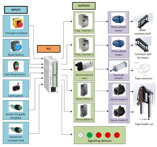 At the output of the PLC, two frequency inverters were used to control the speed and direction of each used conveyor. The servos control was carried out through the communication of the PLC with their respective drivers, and they will act in the movement of the loading car and the “pick-up” system. The PLC also controls the electro-pneumatic drive of the tape extractor. Signals were used to indicate energization, overloads, and sensor failures and whether the system was on or off. The architectural diagram of the electrical system is illustrated in Figure 6.