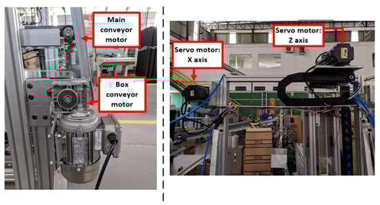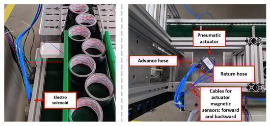 After completing the control panel assembly, it was possible to integrate with the mechanical solution. The peripherals allocated in the mechanical part were the servo-motors, three-phase induction motors, optical sensors, limit switches, and the pneumatic system. The servo motors were coupled to the toothed pulley of the tape loader carriage that uses the principle of belt and pulley to carry out the displacement of the carriage on the x-axis and z-axis and the integration of three-phase induction motors on the track axis, the track motors as shown in Figure 7. The next step is the allocation of sensors, starting with the two sensors that detect when the guide template is complete, and the loader carriage can now start its deposit routine. In addition, the limit switch must be installed on the mechanical structure at the end of the track loader carriage track to signal the limit of the servo-motor operation and indicate the homing position. These elements can be seen in Figure 8. Finally, the pneumatic system, consisting of integrating the pneumatic actuator with the solenoid valve and the pneumatic circuit, was installed. Figure 9 shows the output of the sensor cables, which indicates the status of the pneumatic actuator, in addition to allowing advance and return commands for compressed air through a valve. After the entire implementation process, it is possible to obtain the entire electrical system structured in the Guzzeti packaging machine, as shown in Figure 10.