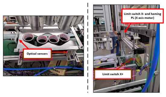 As external input devices for the system, push-buttons were used for the start/stop function and restarting the system, if necessary, in addition to using an emergency key to stop the entire process. A limit switch sensor was also implemented in the application to signal to the PLC the limit of the tape loader displacement, which, in turn, will respond to the servo-motor driver the commands to end the cycle. It was necessary to use four photoelectric sensors, where two of them indicate when the template is complete, aligned with the last and first position of the template, and the other two indicate when the box is prepared and positioned to receive the tapes.
