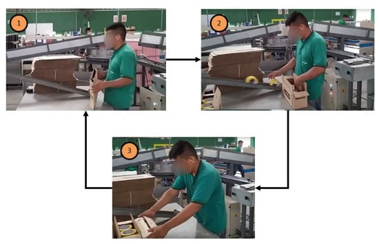 It was necessary to understand the functioning of the tape packaging before the solution to highlight the impact of the Guzzetti packaging machine results. First, the operator had cardboard boxes stacked on the side of the ramp, from where he received the tapes at the workstation. Then, the tapes were placed in standard cardboard boxes. After completing each box, the operator would move it to the left to complete the packing process and start another cycle. Figure 11 illustrates this manual procedure, including the three sequential phases of this process. In terms of biomechanics, step 1 of the figure illustrates the operator’s elbow flexion. Step 2 exposes cervical flexion, elbow flexion, right wrist flexion, and right palm grip. Finally, step 3 illustrates cervical flexion, elbow flexion, and bilateral palm grip.