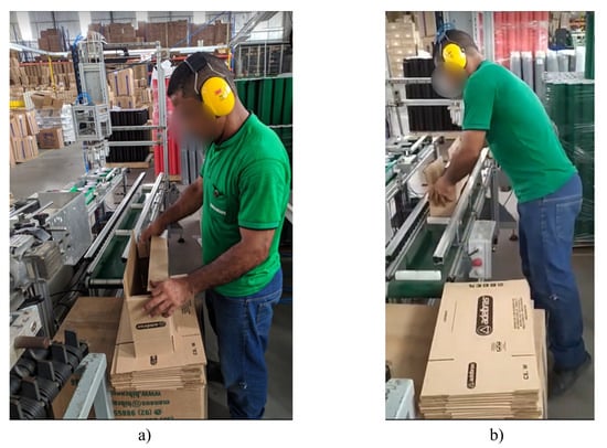 However, manual activity is still required after the installation of the machinery. The activity consists of assembling the box (a) and positioning it on the conveyor (b), as shown in Figure 13. In terms of biomechanics: step 1 of the figure illustrates cervical flexion, elbow flexion, and bilateral palmar grip; step 2 exposes cervical flexion, shoulder flexion, elbow flexion, and bilateral palm grip. Although, this movement requires much less effort. This fact can be evidenced by performing the ergonomic analysis after automation. The results of Suzanne Rodgers and Moore and Garg Evaluation are shown in the Table 8 and Table 9. The REBA results after the automation process are shown in Table 10 and Table 11.