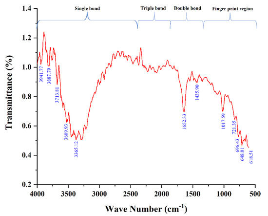 Preliminary phytochemical analysis was carried out, followed by the functional groups analysis present in the A.L. extract of C. orchioides were characterized using FTIR. The A.L. extract was subjected to FTIR (Bruker Optick Gm BH, Germany) characterization with a scan range from 400 to 4000 cm−1. The transmission percentage was recorded against the wavenumber. FTIR values were obtained in peaks, and functional groupings were predicted [25].