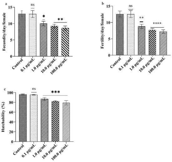 Reproductive assay: (a) fecundity, (b) fertility, (c) percentage hatchability. Significance is ascribed as ns (non-significant), * p < 0.05, ** p < 0.01, *** p < 0.001 and **** p < 0.0001 with respect to control.