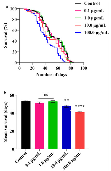Studies have shown that many herbal extracts are known to extend lifespan [47,48]. Hence, we studied the effect of A.L. extract on the fly’s lifespan. After adult eclosion, the flies were fed with A.L. extract of 0.1, 1.0, 10.0, and 100.0 µg/mL. The decline in the survival of adult flies was found to be dose-dependent in A.L. treated groups (Figure 5). The survival of organisms at the lower concentrations (0.1 and 1.0 µg/mL) (mean and percentage survival) was comparable to the control, whereas reduced survival was observed at higher concentrations. The control, 10.0 and 100.0 µg/mL A.L. extract-treated flies showed a mean survival of 53, 47, and 41 days, respectively. The percent reduction in survival at 10.0 and 100.0 µg/mL A.L. extract was found to be 10.32% (p < 0.01) and 22.65% (p < 0.0001), respectively (Figure 5a,b). In previous studies, the exposure of harmala alkaloids showed a reduced life span in Tribolium castaneum and Rhizopertha dominica [49]. The alkaloids present in the aqueous extract of C. orchioides probably affected the organism’s lifespan.