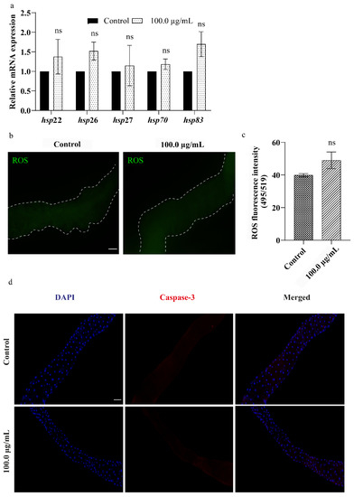 Cells have evolved multiple stress response pathways to protect cellular homeostasis under varying environmental and physiological situations. Among various stress response pathways, the upregulation of Hsps has been considered a first-tier indicator against different stress conditions [50]. Since the gut is the primary site for xenobiotic exposure, the effect of the extract at the cellular level was studied using the gut tissue. To examine whether exposure to A.L. extract causes cellular stress, we evaluated the expression of small hsps (22, 26, and 27) and large hsps (70 and 83) in the larval gut after 96 h of A.L. extract (100.0 µg/mL) exposure. However, none of the hsps expressions was modulated significantly after the treatment of A.L. extract (Figure 6a). Apart from hsps, oxidative stress is one of the critical mediators of cellular toxicity upon xenobiotic exposure [51]. Therefore, the ROS level was estimated in the gut of the A.L. (100.0 µg/mL) exposed (96 h) larvae. Similar to the hsp expression, the ROS levels in the A.L. exposed gut were comparable to the ROS levels of the control gut (Figure 6b,c). Activation of cell death is the primary mode of mechanism during toxicity. Mounting evidence from scientific studies suggests that plant extracts activate cell death in various health and disease conditions [52,53]. Hence, we evaluated the effect of A.L. extract in inducing cell death. Antibody staining against cleaved caspase-3 in larval gut indicated no statistically significant changes in cleaved caspase-3 expression upon A.L. extract exposure compared to the control (Figure 6d). Our findings suggest that insignificant changes in the cellular stress markers and considerable no cell death suggest that A.L. extract might not be toxic to the cells after short-term exposure.
