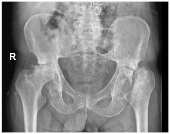 AVN may be caused by trauma, such as fracture, particularly displaced fractures [18], or it can be non-traumatic. The pathogenesis of non-traumatic osteonecrosis is unclear, but there are several established risk factors such as corticosteroid treatment, alcohol abuse, rheumatic diseases, bone-marrow transplantation, or antiretroviral treatment [15,19,20,21,22,23]. Diabetes mellitus (DM), which causes disease of both large vessels (macroangiopathy) and small vessels (microangiopathy) [24], can also increase the risk of avascular osteonecrosis [25,26,27]. Various pathogenic mechanisms in diabetes might additionally impair bone formation, accelerate the apoptosis of bone cells, and reduce the formation of new micro-vessels [1]. Figure 1 presents a case of bilateral AVN in a 62-year-old patient with a history of DM with no other comorbidities.