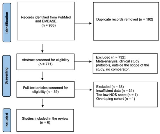 A total of 963 citations were identified, and 39 articles were retrieved in full text. After a full-text review, 31 studies were excluded due to insufficient data, 1 due to poor quality (low NOS score) and 1 due to an overlapping cohort (Figure 2). Overall, 6 studies were included [31,32,33,34,35,36].
