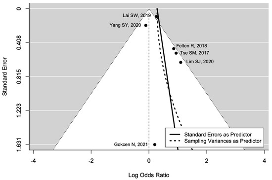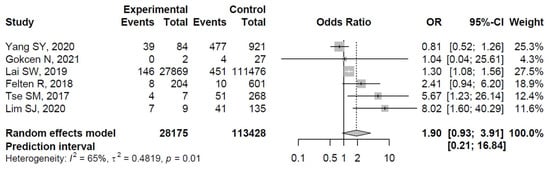 The pooled estimate indicated a non-significantly increased risk of AVN in patients with diabetes (OR = 1.90, 95%CI: 0.93–3.91; Figure 3). There was significant heterogeneity (I2 = 65%, tau2 = 0.48, and p = 0.01; prediction interval, 0.21–16.84; Figure 3). There was no asymmetry in the funnel plot (Figure 4). There was no significant publication bias (Egger’s regression: t = 1.0807, df = 4, and p = 0.34). Based on Rosenthal’s analysis, the number of fail-safe (n = 15) was greater than the number of included observations (n = 6) (p = 0.001), which means there is no risk of publication bias.