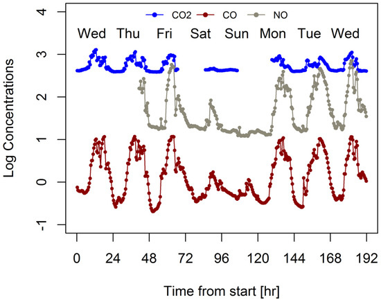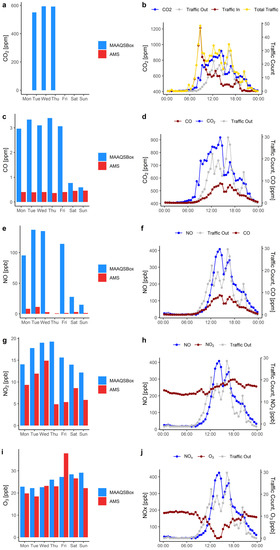 | CO ppm | CO2 ppm | NO ppb | NO2 ppb | NOx ppb | O3 ppb | LDSA µm2cm−3 | PM2.5 µg m−3 | Total Traffic In | Total Traffic Out | |