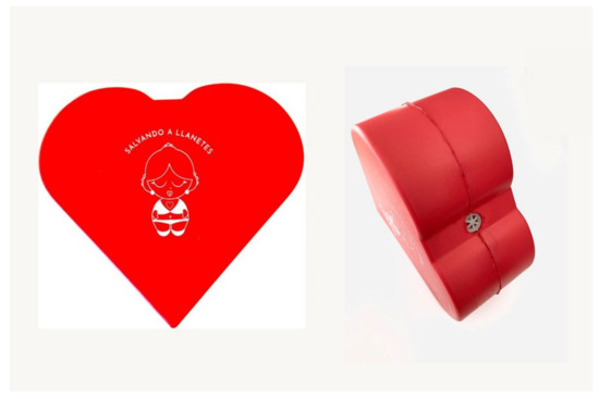 - Salvando a Llanetes® (Cardioprotec&Health, Spain): This is an ultra-compact and extremely economical simulator for basic hands-on CPR training. This is a simple device composed of an auditory feedback heart in plastic material (60 × 60 × 50 mm) that, when compressed perpendicularly and with sufficient force, emits a sound due to the mobilization of the air contained in an interior cavity. This device does not require batteries (Figure 1). The heart is placed on an anthropomorphic figure drawn on a tapestry, on which the basic ERC-CPR algorithm is printed (Figure 2) [5]. The heart, made of plastic material by the Winther-Winther company—Copenhagen, Denmark—is suitable for teaching ECC. It has a hardness of 7 on the Shore D scale s [20] and an auditory feedback system that emits a sound of 65–75 dB in intensity and 6000–8000 Hz in frequency when pressed correctly. The characteristics of hardness and the pressure with which the heart must be compressed are necessary to reach the 50–60 mm described as the adequate depth for ECC in adults [21].