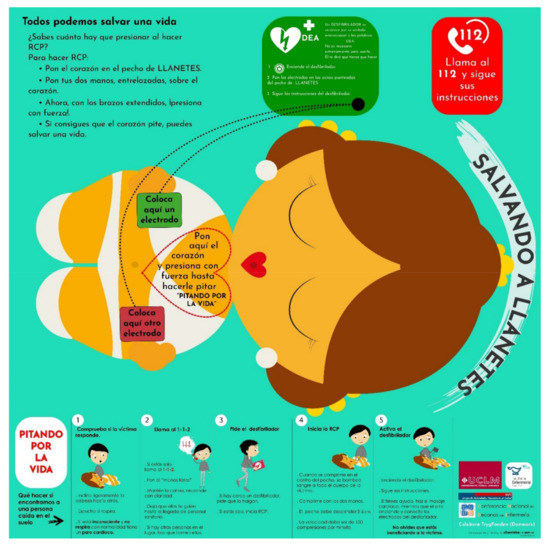 It seems clear that children under 12 old years of age have difficulty performing some of the practical skills involved in learning basic CPR techniques due to their physical characteristics. However, these younger children are capable of learning these and other theoretical issues related to life support (access to the emergency medical system, awareness, etc.), so it is possible to implement training by levels, starting with basic issues in the stage of early childhood, and gradually introducing knowledge and skills according to age and training cycle [32]. “Salvando a Llanetes®” is shown as an adequate device to introduce people to the steps that are part of emergency assistance (security in the area, request for help, request for an AED, etc.) and the practice of ECCs. The level of knowledge that can be transmitted by the alternative device is different depending on the age of the student, which makes it ideal for training at an early age.