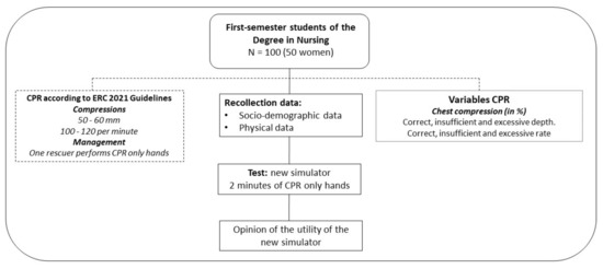 For convenience, first-semester students studying nursing, between 18 and 25 years old, were included during the academic year 2021–2022, without prior knowledge or experience in CPR. Exclusion criteria included having previously received CPR training, suffering from cardiovascular and orthopedic disease, dysfunction that contraindicated or prevented performing CPR maneuvers, or refusal to participate in the study after knowing its objectives. No student met the exclusion criteria.