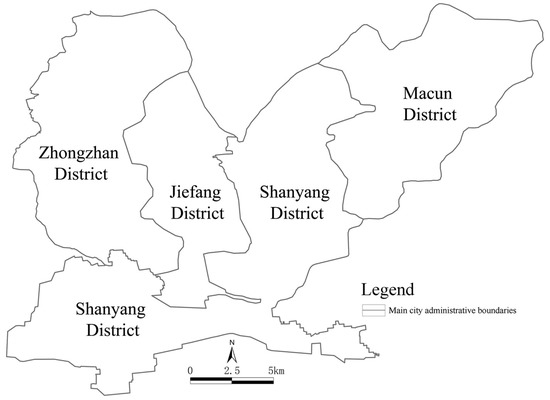 As shown in Figure 1, the main urban area in Jiaozuo comprises four districts covering a total area of 489.81 km2, which accounts for 12.03% of the total area of the city. The resident population in this area numbers 878,500 people, accounting for 24.95% of the city’s total population. As the older urban areas in Jiaozuo, the Jiefang District and Shanyang District are densely populated and rich in industry. With the construction of modern cities, how to stimulate the vitality of urban spaces and realize refined management and development while protecting the historical features of the old cities has become a difficult challenge.
