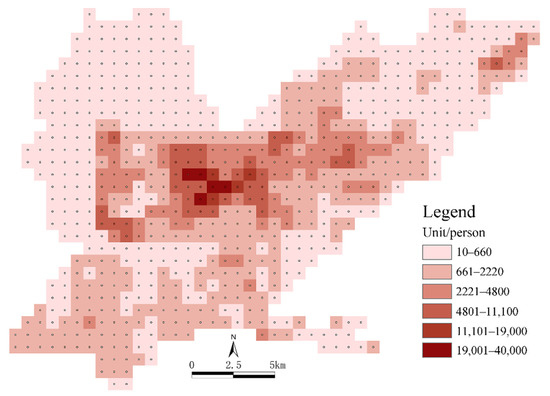 The overall vitality levels of parks and squares were determined using the travel vitality index of urban residents in their areas and the service levels of the parks and squares. One of the most important factors that affects the ability of urban residents to travel is road network density, which is positively related to the travel vitality index of residents, i.e., the higher the road network density in a functional unit, the higher the travel vitality index. The normalization and superposition of the population and road network densities were analyzed according to the constructed POI saliency model [59,60]. The public awareness index was found to be an important factor affecting POI weighting (Table 4). By weighting the public awareness of different functional areas, a model for the travel vitality index of urban residents was established to obtain more detailed spatial distributions of the travel vitality index of residents in the urban functional units (Figure 10).