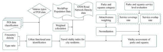 A vitality evaluation system for parks and squares in medium-sized cities was established using four dimensions: urban functional mixing, the travel vitality index of urban residents (including spatial population distribution and traffic network density), the service levels of parks and squares and the attractiveness of parks and squares. We combined the relationships between these various dimensions and used multisource data to determine the research ideas for this article (Figure 4). By cleaning and classifying the POI data, the basic discrimination of urban functional areas and the locations of parks and squares in Jiaozuo’s main urban area were obtained. The single functional and mixed functional areas in Jiaozuo’s main urban area were quantitatively identified using the partition identification method. A significance model for the POIs was constructed in terms of public awareness, and the travel vitality index of urban residents was calculated by integrating WorldPop population density data and OSM road network density data. We classified the parks and squares and assigned them levels of attractiveness. Finally, combined with the two indicators of service coverage and service overlap rate, the overall vitality of parks and squares was comprehensively measured, and the spatial distribution and vitality of parks and squares in the four districts in Jiaozuo’s main urban area were comprehensively evaluated.
