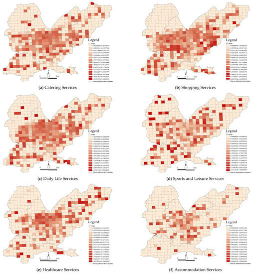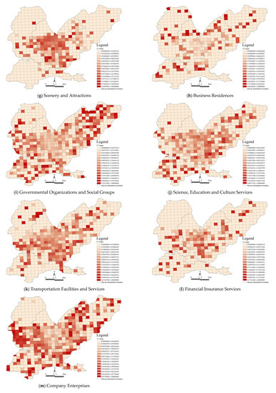 The types of urban functional areas were mainly determined by the types and numbers of POIs. The main urban area in Jiaozuo was divided into 594 functional area units of 1 km2. The number of POIs in each unit was weighted using the partition identification method, which not only considered the spatial distribution of POIs within the whole study area but also considered their density in the functional area units; therefore, we could identify urban functional areas more accurately. Using the above method, 13 functional areas and their corresponding value ranges were identified in the main urban area in Jiaozuo, as shown in Figure 5. Since each functional area corresponded to a different range, this range was used as the basis for the identification of functional areas. The results showed that high-density areas had overlapping functions and strong overall recognition. Most functions were centered around Jiefang District and Shanyang District and showed dispersing east–west clustering characteristics.