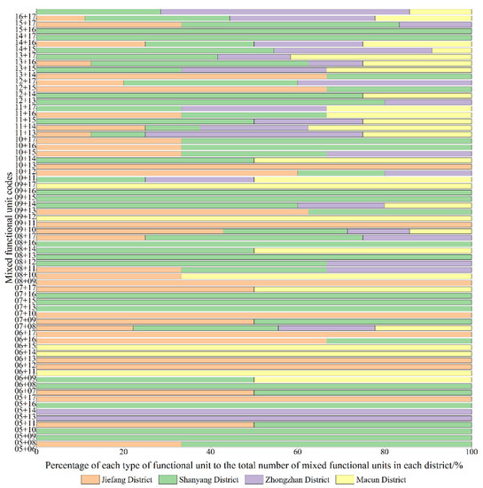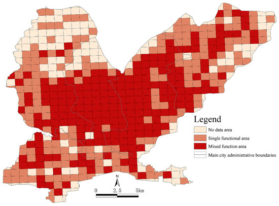 Using Equations (1) and (2) to calculate the values of and , the spatial distributions of single functional areas, mixed functional areas and data-free areas in the four districts of the main urban area in Jiaozuo were obtained (Figure 6). In Figure 5, it can be seen that the single functional areas and mixed functional areas generally showed spatial distribution patterns of single functional areas surrounding mixed functional areas. The mixed functional areas were mostly located in the core of the main urban area and showed clustered distributions, while the single functional areas were mostly located in the peripheral areas and showed fragmented distributions. More specifically, the single functional areas and the data-free areas were mainly distributed in the north of Zhongzhan District, the north of Jiefang District, the southwest of Shanyang District and the northeast of Macun District. The mixed functional areas were concentrated in the east of Zhongzhan District, the central and southern parts of Jiefang District, northern central Shanyang District and the southwest of Macun District. Using the statistics for the three types of functional areas, 230 mixed functional units were located in the central area of the main city, and 192 single functional units were found, mainly scattered around the mixed functional units in the peripheries of the city. There were 173 data-free units, most of which were distributed around single functional units at the urban boundaries.