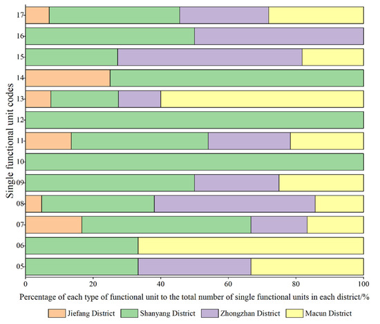 Our overlay analysis of the different functional units showed the spatial distribution patterns of 594 specific single functional units and mixed functional units (Figure 7). The single functional areas were determined by the value of a certain type of data within the functional unit reaching 50% or above. Combined with the number of single functional areas and their proportions, as shown in Figure 8, it was found that company enterprises, governmental organizations and social groups and scenic spots accounted for 29.69%, 20.83% and 19.27%, respectively. Then, sports, leisure and transportation facilities, accommodation services and financial insurance services accounted for smaller proportions. Companies and governmental agencies occupied larger areas, and it was relatively easy for them to form single functional units. Scenic spots were considered as public service areas due to their services provided and their overall dispersion, local concentration and distribution within the main urban area. Commercial single functional spaces, such as restaurants and shops, were more sporadically distributed in Zhongzhan District and Macun District, where there were fewer mixed functional areas. Residential single functional units, such as accommodation services and commercial housing, were distributed in Shanyang District (one of the older urban areas), which also had the lowest proportion of single functional units (1.04%). In general, Shanyang District had more single functional areas (70), and the functional categories were diverse. Macun and Zhongzhan Districts had single functional areas with similar functional types and quantities, and Jiefang District had the smallest number of single functional areas (15).