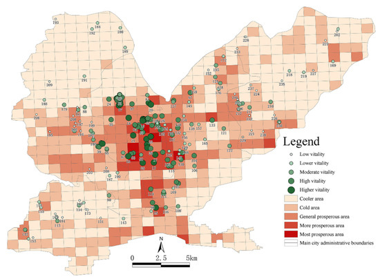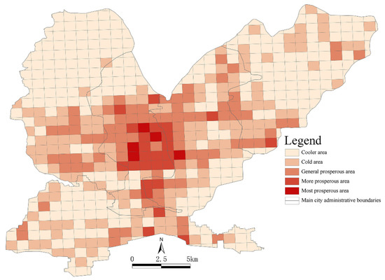Using the natural discontinuity point method proposed in ArcGIS to visualize the travel vitality index of residents for 594 functional units, we found that the spatial distributions of the travel vitality index of urban residents in different areas had obvious concentric ring radiation characteristics and significant spatial differences. In terms of regional location, Jiefang District had a high mobility index, as it was very busy and had more prosperous areas located in its center. Shanyang District had more generally prosperous areas, but it was less busy and had fewer prosperous areas. Zhongzhan District contained more cool areas, and Macun District was the area with the lowest mobility index. The most prosperous areas included Tianhe Park, Rule of Law and Culture Square, People’s Park and Zhuque Park, which showed a contiguous distribution around the railway station. The busier areas, which mostly contained places such as churches and universities, were mostly distributed around other very busy areas. The generally prosperous areas were characterized by certain clustering scales on the whole and were more often located in the middle of the adjacent Jiefang and Zhongzhan Districts. Cooler areas were the norm on the peripheries of the main urban areas, such as the northeastern part of the Macun District and the northern part of the Zhongzhan District. These areas covered more data-free functional areas, mostly in the primary industry with a low population density, underdeveloped transportation networks and low accessibility.