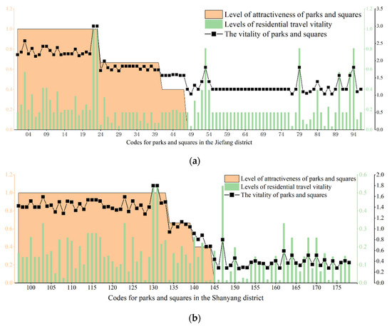 In this study, the attractiveness of parks and squares, the richness of their surrounding businesses, the road network and population densities and the service levels of the area were used as indicators to measure the vitality of parks and squares. The weights of the influencing factors were determined from existing research and expert scoring. Using the data presented in Table 3, Equation (4) and Table 6, as well as the weights of the influencing factors, the vitality of 238 parks and squares was calculated, and the indicators were standardized and normalized. According to the categories of “higher vitality”, “high vitality”, “medium vitality”, “low vitality” and “lower vitality”, a vitality classification map of the 238 parks and squares in the main urban area in Jiaozuo was obtained using the natural discontinuity method (Figure 11). By overlaying this map onto the map of the travel vitality index of urban residents, we found that most functional units showed an overlap between high- and low-vitality parks and squares and high and low travel vitality indices of urban residents. However, a few functional units with high travel vitality indices of urban residents did not contain parks and squares, indicating that as a medium-sized city, Jiaozuo should further increase the number of parks and squares to meet the needs of its residents. Overall, the vitality levels of the parks and squares in the Jiefang District were central to their attractiveness, and a total of 24 of the highest-vitality parks and squares were distributed in the Jiefang District. People’s Square, People’s Park, South Tower, etc., were representative of these parks, as the service levels were more abundant, the road network was more developed, and the flow of people was more attractive. The parks and squares with medium to high vitality were mostly distributed around the middle of Shanyang District, the western part of Macun District and the eastern part of Zhongzhan District, such as Taiji Square, Longyuan Lake Park, Macun Park and the Ecological Botanical Gardens. Due to the lag in urban construction, the surrounding functional areas mostly had single functions, resulting in the relatively low vitality of the parks and squares. The parks and squares with lower vitality were sporadically distributed in the peripheral areas of Macun District and Zhongzhan District. The surrounding road networks were sparse and residents’ accessibility to the parks and squares was low, so their vitality was greatly affected.