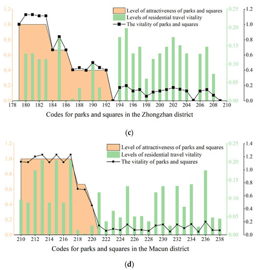 In addition to the different service levels of the parks and squares, we studied the impact of the functional mixing, road network density, spatial population distribution and attractiveness of parks and squares on their vitality in each district. Under the condition of the same service level, the main urban area was disassembled according to the administrative districts, and the current vitality of the parks and squares in each district was analyzed. All parks and squares within each district were ranked according to decreasing attractiveness to obtain the final results (Figure 12). It can be seen from the figure that the parks and squares with the highest vitality among the four districts were in the Jiefang District (3.5 points), followed by those in the Shanyang District, and the parks and squares with the lowest vitality were in the middle station area (1.2 points). The vitality of the parks and squares in the four districts showed a high degree of correlation with the service levels of the areas. We found that in Jiefang District (i.e., the district with the highest vitality score), approximately 50% of the parks and squares had high levels of attractiveness, the number of parks and squares in this area was more than adequate, and the spatial layout was more reasonable. This indicated that there was a high potential for residents to visit parks and squares in this area and that the overall vitality of parks and squares was high (Figure 12a). Nearly 60% of the parks and squares in Shanyang District had high attractiveness levels, which exceeded the proportion in Jiefang District; however, due to the relatively low levels of business richness and road network accessibility, combined with the higher service overlap rate than coverage rate, the spatial distribution was uneven, resulting in lower overall vitality of parks and squares in the district than in Jiefang District (Figure 12b). There were large variations in the vitality of parks and squares in Zhongzhan District, and there were areas where the vitality value was 0 (Figure 12c). On the one hand, while the area of Zhongzhan District is 1.75 times larger than that of Jiefang District, we found that the number of parks and squares was only 32.3% of that in Jiefang District, indicating that the parks and squares within the district did not meet the needs of its residents. On the other hand, this could be due to the poor correlation between the distribution of parks and squares with high levels of attractiveness and areas with high travel vitality indices of residents. The overall vitality of parks and squares in Macun District was low (Figure 12d) due to its marginal location in the eastern part of the main urban area, as well as the single functional areas and poor traffic accessibility brought about by lagging urban development, which affected the vitality of the parks and squares. By looking at the vitality of the parks and squares in the main urban area, it can be seen that the smaller and more densely populated Jiefang District had a higher number and better laid out parks and squares. The other three districts, which were relatively sparsely populated, covered large areas and contained good natural environments. In future urban construction or green space development, parks and squares could be used to alleviate population pressures and offer great development potential that is more conducive to improving the overall spatial vitality of the main urban area.