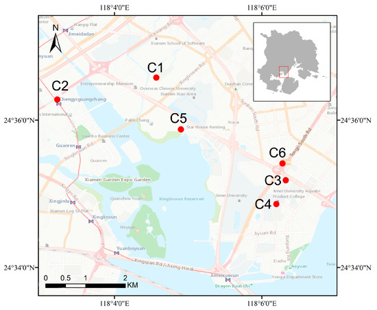 Residential green space from 6 different neighborhoods in Jimei District of Xiamen City were used as an example. Xiamen (24°23′–24°54′ N, 117°53′–118°26′ E) is an important central city of the south-east China coastal region, a harbor, and a famous tourist destination. The city consists of Xiamen Island, Gulang Island, some other small islands, and its mainland part. It covers a terrestrial area of 1699 km2 and an ocean area of 390 km2. Xiamen is located in a subtropical marine monsoon climate zone. It has a high percentage of forest coverage and holds beautiful natural landscapes. Thus, neighborhoods in Xiamen chosen for the study can be representative examples. Since green space is the most frequently used land type and residential green space is closely related to residents’ daily lives, i.e., the constructing quality of residential green space can impact the residents’ life quality and mental health [38] (Gascon et al., 2018), residential green space as a research object was embraced. To control variables such as economy, climate, and transport, six neighborhoods from Jimei District of Xiamen which have similar ages and building qualities were favored (Figure 2, Table 1).