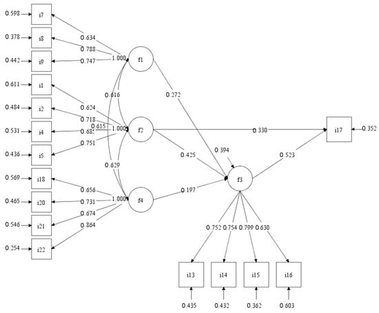 In the exploratory factor analysis, Kaiser-Meyer-Olkin (KMO) and Bartlett’s test were performed on the rationality of the conceptual model. The KMO value was 0.903, and the p-value from Bartlett’s Test of Sphericity was lower than 0.001. The factor loadings of visual field (I1), plant odor (I5), and noise (I6) below 0.5 were excluded. Table S3 showed that the four common factors were identified, which are consistent with the four latent variables in the conceptual model (Figure 2). The cumulative variance value of more than 60% indicates that the respondents’ satisfaction with residential green space has been well explained. All factor loadings of the rotated component matrix value more than 0.58 indicates a strong correlation between the eighteen observed variables and the common factors.