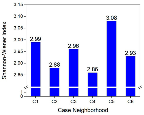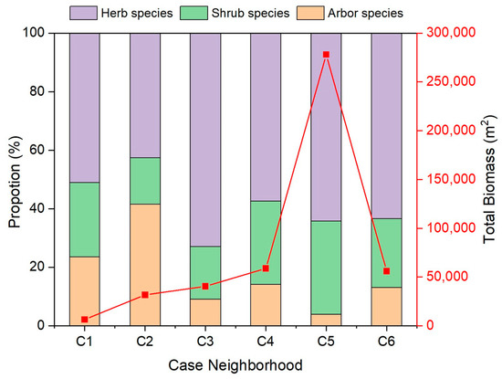 Figure 4 shows the plant diversity in the six neighborhoods. The Shannon–Wiener species diversity indices of the six neighborhoods were relatively close. This indicates that the plant uniformity difference is small, and the species richness index is large in the six neighborhoods. Figure 5 shows the total biomass of vegetation in the six case neighborhoods. The C4 neighborhood had the highest biomass, reaching 278,000 m2, while the biomass in the C1 neighborhood was dramatically low, which was only 6346 m2. In the composition structure of the total biomass, herbs accounted for the largest proportion, followed by shrubs.