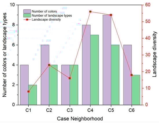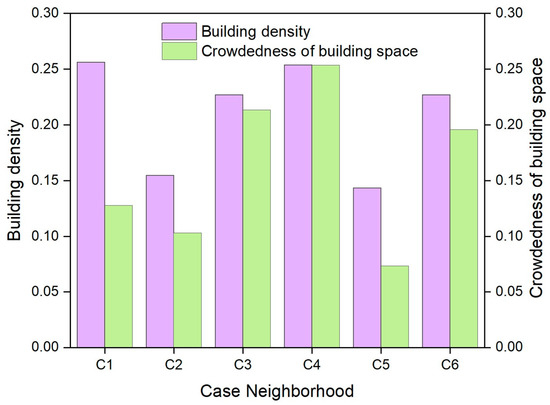 Figure 6 shows the colors and landscape types. Case neighborhoods C4 and C5 have a greater number of colors and landscape types than the other case neighborhoods, while C1 and C2 have the lowest number of colors, and C1 is the case neighborhood that has the lowest number of landscape types. The complexity of landscape components characterizing landscape diversity is also shown in Figure 6. C1 has the lowest complexity of landscape components, while both C4 and C5 have much higher complexity than the other case neighborhoods, which is approximately six to seven times that of C1. Figure 7 shows the building density and crowdedness of building space. Both building density and building space crowdedness of C3, C4, and C6 are relatively high, while they are relatively low in C2 and C5, indicating a better condition of landscape openness in C2 and C5.