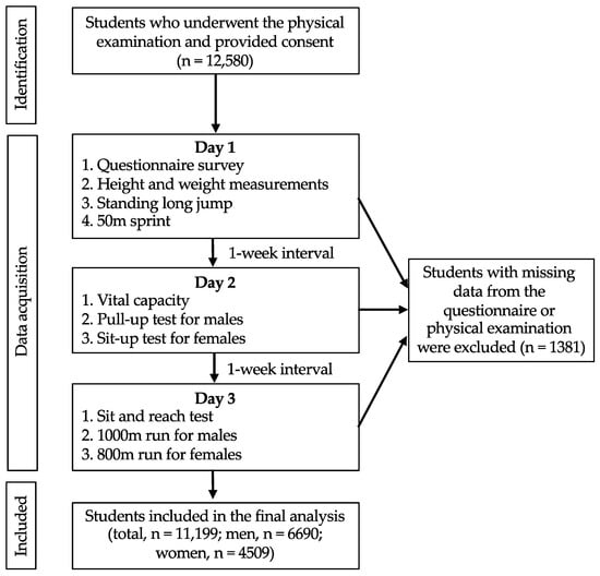We recruited participants through an annual physical health examination of university students at Huaiyin Institute of Technology in Jiangsu, China, between September 2018 and October 2018. All students must have participated in the examination, and those who satisfied our study inclusion criteria were invited to participate in the study. Students with physical disabilities, cardiovascular diseases, respiratory diseases, or special reasons or circumstances that prevented them from participating were excluded before the physical examinations were performed. The physical health examinations were performed at the sports facilities by 40 experienced instructors working at the university. We administered a questionnaire under the guidance of the instructors before the examinations were performed. All of the participants voluntarily joined the study, and written consent was obtained from those willing to participate in the study. This study was approved by the ethics committee of Huaiyin Institute of Technology. A total of 12,580 students aged 19.6 ± 1.4 years agreed to participate in the study. We excluded participants whose questionnaire data (n = 543) or physical fitness data (n = 838) were missing. The final study population included 11,199 participants (6690 male students and 4509 female students). The sample selection process is shown in Figure 1.