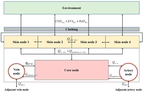 For each segment, the schematic diagram of heat transfer between the core, artery, vein, and four skin nodes is shown in Figure 2. The energy balance equations for the seven nodes after modification of Salloum’s energy balance equation [13] are as follows.