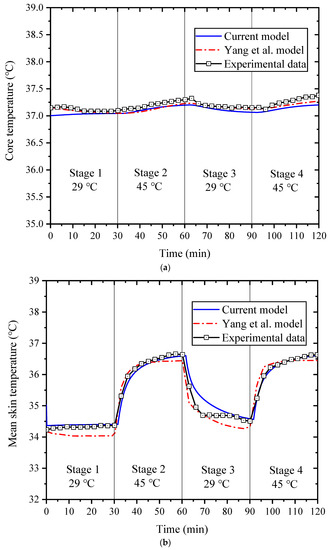 Comparison of core temperature (a) and mean skin temperature (b) between the experimental data and simulated results of Yang et al. [18] and the simulated results calculated with the current model.