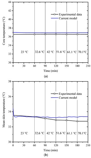 Concerning the core temperature (a) and mean skin temperature (b), the comparisons of the experimental data [38] with the simulation results of the current model are shown in Figure 4. As a result, the model-predicted core temperature and mean skin temperature differed most from the experimental data by 0.45 °C and 0.96 °C, respectively. Therefore, the modified model can accurately predict the core and average skin temperature throughout the process.