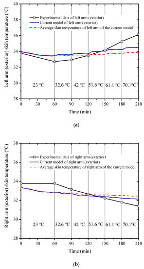 Figure 5 shows the comparison of the left arm (exterior) skin temperature (a), right arm (exterior) skin temperature (b), and right thigh (anterior) skin temperature (c) between the experimental data [38] and the simulated results calculated with the current model. The calculated temperatures of the three body segments are in good agreement with the experimental data, and the maximum difference is within 2 °C. The results show that the extended model can accurately predict the human core temperature and skin temperature in asymmetric high-temperature environments.