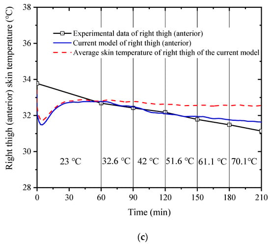 Comparison of the left arm (exterior) skin temperature (a), right arm (exterior) skin temperature, (b) and right thigh (anterior) skin temperature (c) between the experimental data [38] and the simulated results calculated with the current model.
