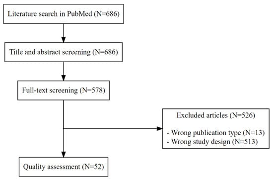 After screening 686 titles and abstracts and subsequently reviewing 578 full articles, we finally included 52 articles. The included and excluded articles are summarized in Supplementary Table S4.