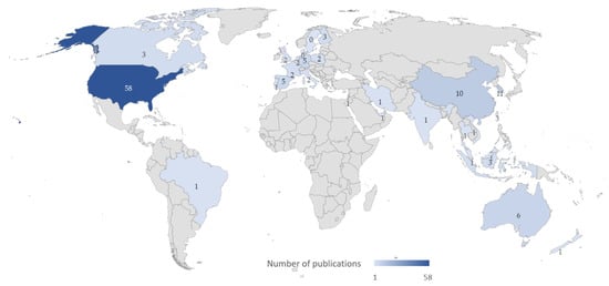 According to the results and the database, Figure 3 shows a map of the countries that conducted the identified research works. The countries with the highest number of publications appear in dark tones, with lighter colors decreasing as the number of publications decreases. The countries with the highest number of scientific articles published are the United States (45%), South Korea (8.5%), and China (7.8%). The number of publications from the United States is considerably higher than from other countries.