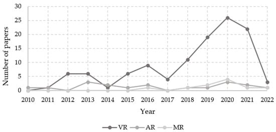 Following the research methodology and established criteria, 129 articles were selected for the literature review. Figure 2 shows the annual distribution of the 129 articles analyzed between 2010 and 2022. The database search ended in June 2022, so the number of papers found for the current year is low. The distribution tends to rise, increasing substantially between 2019 and 2021, so this amount will likely be equal to or higher for 2022 when the database is incomplete. In 2010 and 2011, the number of articles published was minimal. However, from 2012 onwards, there was an increase in the number of papers related to XR technologies. This trend is evidence of the increase in research on these tools.