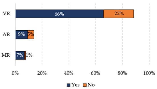 Of the total of 129 articles, Figure 4 shows the number of studies each year related to the technologies of interest, either VR, AR, or MR. VR was the most used over the years compared to the other technologies, and it presented an increasing trend, which increased considerably from 2018 onwards. The AR and MR technologies were used less frequently in the studies, having an almost linear trend over the years. Some articles addressed more than one technology. The figure shows that 88.4% of the studies used virtual reality (114 articles), 14% used augmented reality (18 articles), and only 7.8% used mixed reality (10 articles).